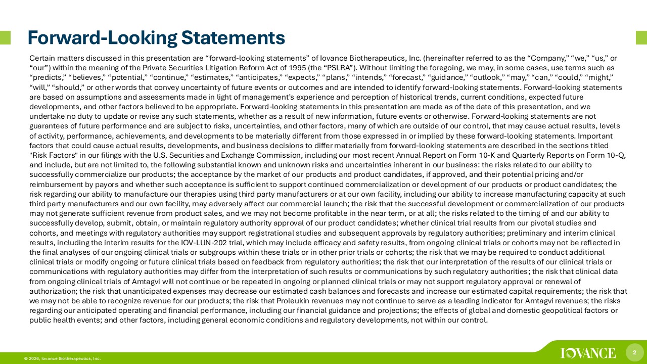 2 © 2026, Iovance Biotherapeutics, Inc. Forward - Looking Statements Certain matters discussed in this presentation are “forward - looking statements” of Iovance Biotherapeutics, Inc. (hereinafter referred to as the “Company,” “we,” “us,” or “our”) within the meaning of the Private Securities Litigation Reform Act of 1995 (the “PSLRA”). Without limiting the foregoi ng, we may, in some cases, use terms such as “predicts,” “believes,” “potential,” “continue,” “estimates,” “anticipates,” “expects,” “plans,” “intends,” “forecast,” “guid anc e,” “outlook,” “may,” “can,” “could,” “might,” “will,” “should,” or other words that convey uncertainty of future events or outcomes and are intended to identify forward - looki ng statements. Forward - looking statements are based on assumptions and assessments made in light of management’s experience and perception of historical trends, current conditions, expected future developments, and other factors believed to be appropriate. Forward - looking statements in this presentation are made as of the d ate of this presentation, and we undertake no duty to update or revise any such statements, whether as a result of new information, future events or otherwise. Forward - looking statements are not guarantees of future performance and are subject to risks, uncertainties, and other factors, many of which are outside of our co ntrol, that may cause actual results, levels of activity, performance, achievements, and developments to be materially different from those expressed in or implied by the se forward - looking statements. Important factors that could cause actual results, developments, and business decisions to differ materially from forward - looking statemen ts are described in the sections titled "Risk Factors" in our filings with the U.S. Securities and Exchange Commission, including our most recent Annual Report on Fo rm 10 - K and Quarterly Reports on Form 10 - Q, and include, but are not limited to, the following substantial known and unknown risks and uncertainties inherent in our busi nes s: the risks related to our ability to successfully commercialize our products; the acceptance by the market of our products and product candidates, if approved, and their potential pricing and/or reimbursement by payors and whether such acceptance is sufficient to support continued commercialization or development of ou r p roducts or product candidates; the risk regarding our ability to manufacture our therapies using third party manufacturers or at our own facility, including our ab ility to increase manufacturing capacity at such third party manufacturers and our own facility, may adversely affect our commercial launch; the risk that the successful deve lop ment or commercialization of our products may not generate sufficient revenue from product sales, and we may not become profitable in the near term, or at all; the risks r el ated to the timing of and our ability to successfully develop, submit, obtain, or maintain regulatory authority approval of our product candidates; whether clinical t ria l results from our pivotal studies and cohorts, and meetings with regulatory authorities may support registrational studies and subsequent approvals by regulatory a uth orities ; preliminary and interim clinical results, including the interim results for the IOV - LUN - 202 trial, which may include efficacy and safety results, from ongoing clinical trials or cohorts may not be reflected in the final analyses of our ongoing clinical trials or subgroups within these trials or in other prior trials or cohorts; the r isk that we may be required to conduct additional clinical trials or modify ongoing or future clinical trials based on feedback from regulatory authorities; the risk that our int erpretation of the results of our clinical trials or communications with regulatory authorities may differ from the interpretation of such results or communications by such regul ato ry authorities ; the risk that clinical data from ongoing clinical trials of Amtagvi will not continue or be repeated in ongoing or planned clinical trials or may not support regulatory approval or renewal of authorization; the risk that unanticipated expenses may decrease our estimated cash balances and forecasts and increase our e sti mated capital requirements; the risk that we may not be able to recognize revenue for our products; the risk that Proleukin revenues may not continue to serve as a leading indicator for Amtagvi revenues; the risks regarding our anticipated operating and financial performance, including our financial guidance and projections; the effects of global and domestic geopolitical factors or public health events ; and other factors, including general economic conditions and regulatory developments, not within our control.