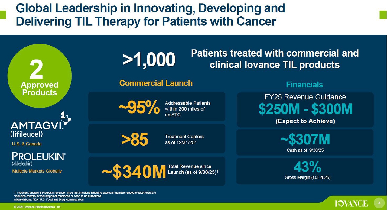 2 © 2026, Iovance Biotherapeutics, Inc. Forward - Looking Statements Certain matters discussed in this presentation are “forward - looking statements” of Iovance Biotherapeutics, Inc. (hereinafter referred to as the “Company,” “we,” “us,” or “our”) within the meaning of the Private Securities Litigation Reform Act of 1995 (the “PSLRA”). Without limiting the foregoi ng, we may, in some cases, use terms such as “predicts,” “believes,” “potential,” “continue,” “estimates,” “anticipates,” “expects,” “plans,” “intends,” “forecast,” “guid anc e,” “outlook,” “may,” “can,” “could,” “might,” “will,” “should,” or other words that convey uncertainty of future events or outcomes and are intended to identify forward - looki ng statements. Forward - looking statements are based on assumptions and assessments made in light of management’s experience and perception of historical trends, current conditions, expected future developments, and other factors believed to be appropriate. Forward - looking statements in this presentation are made as of the d ate of this presentation, and we undertake no duty to update or revise any such statements, whether as a result of new information, future events or otherwise. Forward - looking statements are not guarantees of future performance and are subject to risks, uncertainties, and other factors, many of which are outside of our co ntrol, that may cause actual results, levels of activity, performance, achievements, and developments to be materially different from those expressed in or implied by the se forward - looking statements. Important factors that could cause actual results, developments, and business decisions to differ materially from forward - looking statemen ts are described in the sections titled "Risk Factors" in our filings with the U.S. Securities and Exchange Commission, including our most recent Annual Report on Fo rm 10 - K and Quarterly Reports on Form 10 - Q, and include, but are not limited to, the following substantial known and unknown risks and uncertainties inherent in our busi nes s: the risks related to our ability to successfully commercialize our products; the acceptance by the market of our products and product candidates, if approved, and their potential pricing and/or reimbursement by payors and whether such acceptance is sufficient to support continued commercialization or development of ou r p roducts or product candidates; the risk regarding our ability to manufacture our therapies using third party manufacturers or at our own facility, including our ab ility to increase manufacturing capacity at such third party manufacturers and our own facility, may adversely affect our commercial launch; the risk that the successful deve lop ment or commercialization of our products may not generate sufficient revenue from product sales, and we may not become profitable in the near term, or at all; the risks r el ated to the timing of and our ability to successfully develop, submit, obtain, or maintain regulatory authority approval of our product candidates; whether clinical t ria l results from our pivotal studies and cohorts, and meetings with regulatory authorities may support registrational studies and subsequent approvals by regulatory a uth orities ; preliminary and interim clinical results, including the interim results for the IOV - LUN - 202 trial, which may include efficacy and safety results, from ongoing clinical trials or cohorts may not be reflected in the final analyses of our ongoing clinical trials or subgroups within these trials or in other prior trials or cohorts; the r isk that we may be required to conduct additional clinical trials or modify ongoing or future clinical trials based on feedback from regulatory authorities; the risk that our int erpretation of the results of our clinical trials or communications with regulatory authorities may differ from the interpretation of such results or communications by such regul ato ry authorities ; the risk that clinical data from ongoing clinical trials of Amtagvi will not continue or be repeated in ongoing or planned clinical trials or may not support regulatory approval or renewal of authorization; the risk that unanticipated expenses may decrease our estimated cash balances and forecasts and increase our e sti mated capital requirements; the risk that we may not be able to recognize revenue for our products; the risk that Proleukin revenues may not continue to serve as a leading indicator for Amtagvi revenues; the risks regarding our anticipated operating and financial performance, including our financial guidance and projections; the effects of global and domestic geopolitical factors or public health events ; and other factors, including general economic conditions and regulatory developments, not within our control.