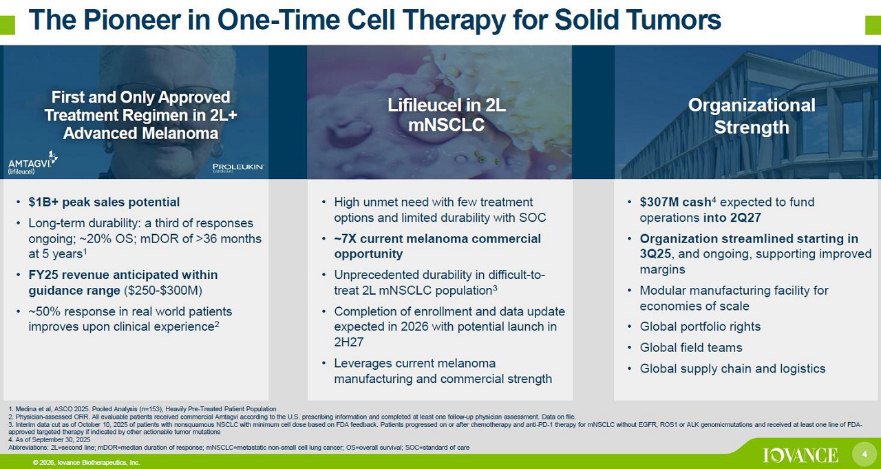 3 © 2026, Iovance Biotherapeutics, Inc. Global Leadership in Innovating, Developing and Delivering TIL Therapy for Patients with Cancer 3 Approved Products Commercial Launch Financials >85 ~$307M Cash as of 9/30/25 Treatment Centers as of 12/31/25* 2 ~95% 43% Gross Margin (Q3 2025) © 2026, Iovance Biotherapeutics, Inc. 1. Includes Amtagvi & Proleukin revenue for quarters ended 3/31/24 - 9/30/25 *Includes center s in final stages of readiness or soon to be authorized. Abbreviations: BTD=Breakthrough Therapy Designation; FDA=U.S. Food and Drug Administration; RMAT=Regenerative Medicine Advanc ed Therapy Designation >1,000 Patients treated with commercial and clinical Iovance TIL products U.S. & Canada Multiple Markets Globally $340M FY25 Revenue Guidance $250M - $300M (Expect to Achieve) Addressable Patients within 200 miles of an ATC Total Revenue as of 9/30/2025 since Q1 2024 Amtagvi FDA Approval 1