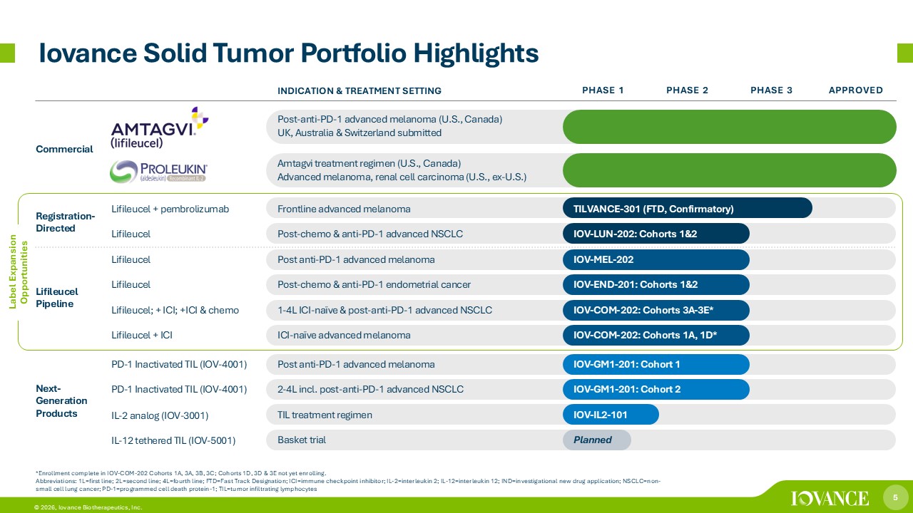 4 © 2026, Iovance Biotherapeutics, Inc. The Pioneer in One - Time Cell Therapy for Solid Tumors 4 Abbreviations: FTD, fast track designation; ICI, immune checkpoint inhibitor; NSCLC, non - small cell lung cancer; PD - 1, programme d cell death protein - 1 1. Medina et al, ASCO 2025. Pooled Analysis (n=153), Heavily Pre - Treated Patient Population 2. Physician - assessed ORR. All evaluable patients received commercial Amtagvi according to the U.S. prescribing information and completed at least one follow - up physician assessment. Data on file. 3. Interim data cut as of October 10, 2025 of patients with nonsquamous NSCLC with minimum cell dose based on FDA feedback. Patients progressed on or after chemotherapy and anti - PD - 1 therapy for mNSCLC without EGFR, ROS1 or ALK genomicmutations and received at least one line of FDA - approved targeted therapy if indicated by other actionable tumor mutations 4. As of September 30, 2025 Abbreviations: 2L=second line; mDOR =median duration of response; mNSCLC =metastatic non - small cell lung cancer; OS=overall survival; NR=not reached; ORR=objective response rate; SOC=standard of care Organizational Strength Lifileucel in 2L mNSCLC First and Only Approved Treatment Regimen in 2L+ Advanced Melanoma • $307M cash 4 expected to fund operations into 2Q27 • Organization streamlined in 3Q25 supporting improved margins • Modular manufacturing facility for economies of scale • Global portfolio rights • Global field teams • Global supply chain and logistics • High unmet need with few treatment options and limited durability with SOC • ~7X current melanoma opportunity • Unprecedented durability in difficult - to - treat 2L mNSCLC population 3 • Completion of enrollment and data update expected in 2026 with potential launch in 2H27 • Leverages current melanoma manufacturing and commercial strength • $1B+ peak sales potential • Long - term durability: a third of responses ongoing; ~20% OS; mDOR of >36 months at 5 years 1 • FY25 revenue anticipated within guidance range ($250 - $300M) • ~50% response in real world patients improves upon clinical experience 2