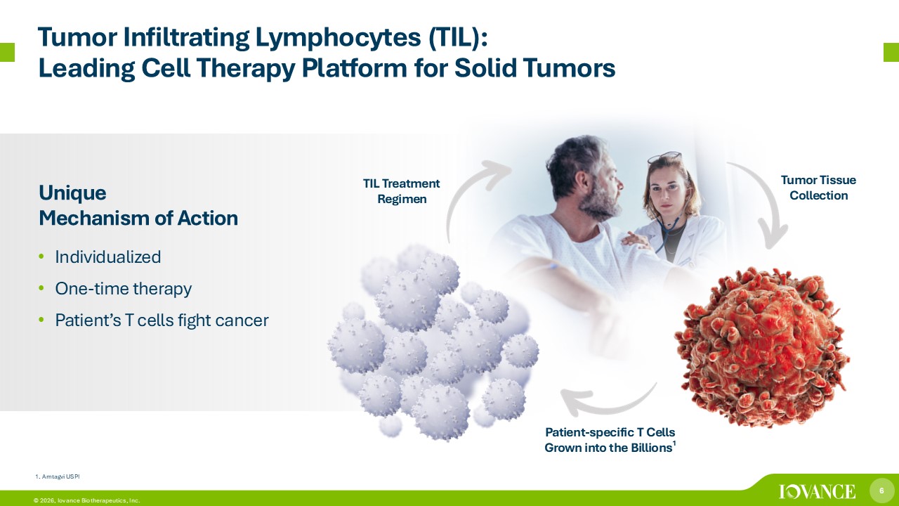 5 © 2026, Iovance Biotherapeutics, Inc. Iovance Solid Tumor Portfolio Highlights *Enrollment complete in IOV - COM - 202 Cohorts 1A, 3A, 3B, 3C ; Cohorts 1D, 3D & 3E not yet enrolling. Abbreviations: 1L=first line; 2L=second line; 4L=fourth line; FTD=Fast Track Designation; ICI=immune checkpoint inhibitor; IL - 2= interleukin 2; IL - 12=interleukin 12; IND=investigational new drug application; NSCLC=non - small cell lung cancer; PD - 1=programmed cell death protein - 1; TIL=tumor infiltrating lymphocytes Label Expansion Opportunities APPROVED PHASE 3 PHASE 2 PHASE 1 INDICATION & TREATMENT SETTING Post - anti - PD - 1 advanced melanoma (U.S., Canada) UK, Australia & Switzerland submitted Commercial Amtagvi treatment regimen (U.S., Canada) Advanced melanoma, renal cell carcinoma (U.S., ex - U.S.) TILVANCE - 301 (FTD, Confirmatory) Frontline advanced melanoma Lifileucel + pembrolizumab Registration - Directed IOV - LUN - 202: Cohorts 1&2 Post - chemo & anti - PD - 1 advanced NSCLC Lifileucel IOV - MEL - 202 Post anti - PD - 1 advanced melanoma Lifileucel Lifileucel Pipeline IOV - END - 201: Cohorts 1&2 Post - chemo & anti - PD - 1 endometrial cancer Lifileucel IOV - COM - 202: Cohorts 3A - 3E* 1 - 4L ICI - naïve & post - anti - PD - 1 advanced NSCLC Lifileucel; + ICI; +ICI & chemo IOV - COM - 202: Cohorts 1A, 1D* ICI - naïve advanced melanoma Lifileucel + ICI IOV - GM1 - 201: Cohort 1 Post anti - PD - 1 advanced melanoma PD - 1 Inactivated TIL (IOV - 4001) Next - Generation Products IOV - GM1 - 201: Cohort 2 2 - 4L incl. post - anti - PD - 1 advanced NSCLC PD - 1 Inactivated TIL (IOV - 4001) IOV - IL2 - 101 TIL treatment regimen IL - 2 analog (IOV - 3001) Planned Basket trial IL - 12 tethered TIL (IOV - 5001)
