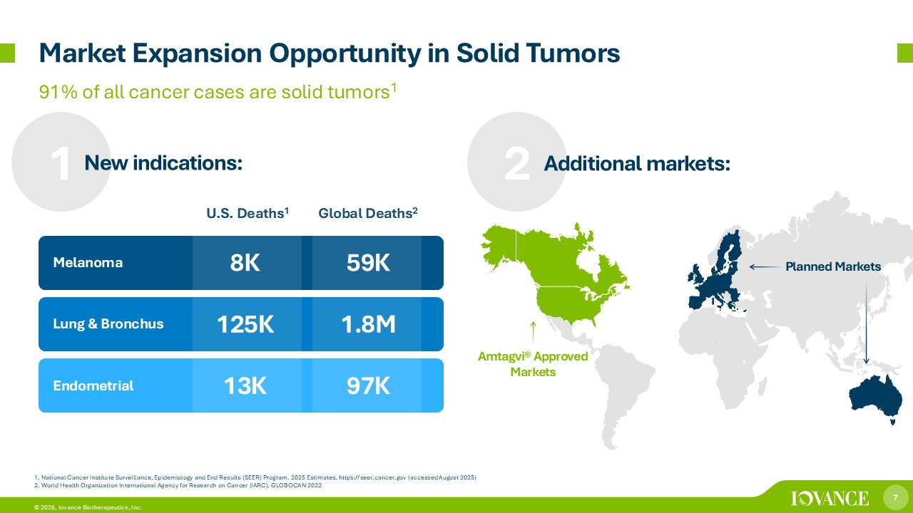 6 © 2026, Iovance Biotherapeutics, Inc. Tumor Infiltrating Lymphocytes (TIL): Leading Cell Therapy Platform for Solid Tumors Unique Mechanism of Action • Individualized • One - time therapy • Patient’s T cells fight cancer Tumor Tissue Collection Patient - specific T Cells Grown into the Billions 1 TIL Treatment Regimen 1. Amtagvi USPI