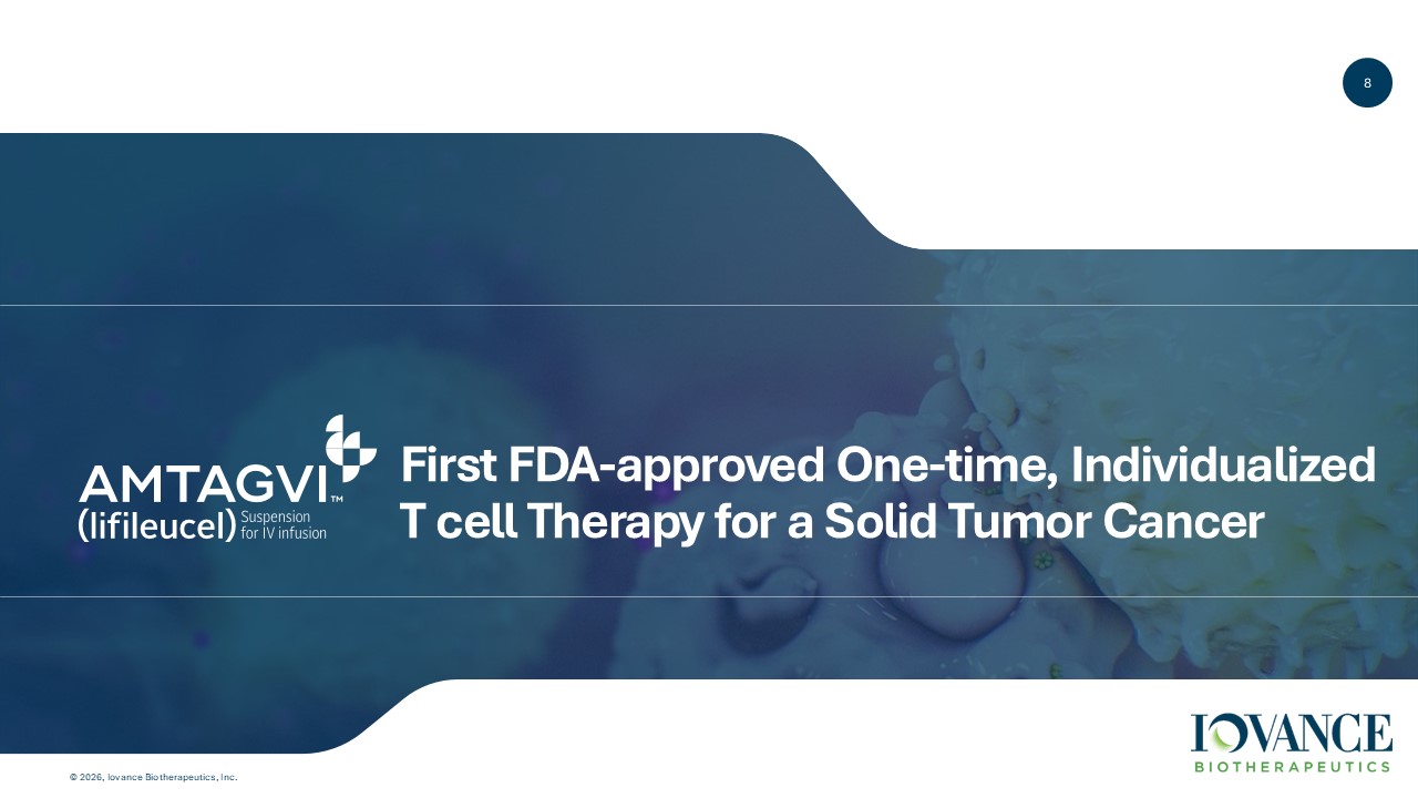 7 © 2026, Iovance Biotherapeutics, Inc. Global Deaths 2 U.S. Deaths 1 59K 8K Melanoma 1.8M 125K Lung & Bronchus 97K 13K Endometrial 1. National Cancer Institute Surveillance, Epidemiology and End Results (SEER) Program. 2025 Estimates. https://seer.cancer.g ov (accessed August 2025) 2. World Health Organization International Agency for Research on Cancer (IARC). GLOBOCAN 2022 91% of all cancer cases are solid tumors 1 Market Expansion Opportunity in Solid Tumors 1 New indications: 2 Additional markets: Amtagvi® Approved Markets Planned Markets
