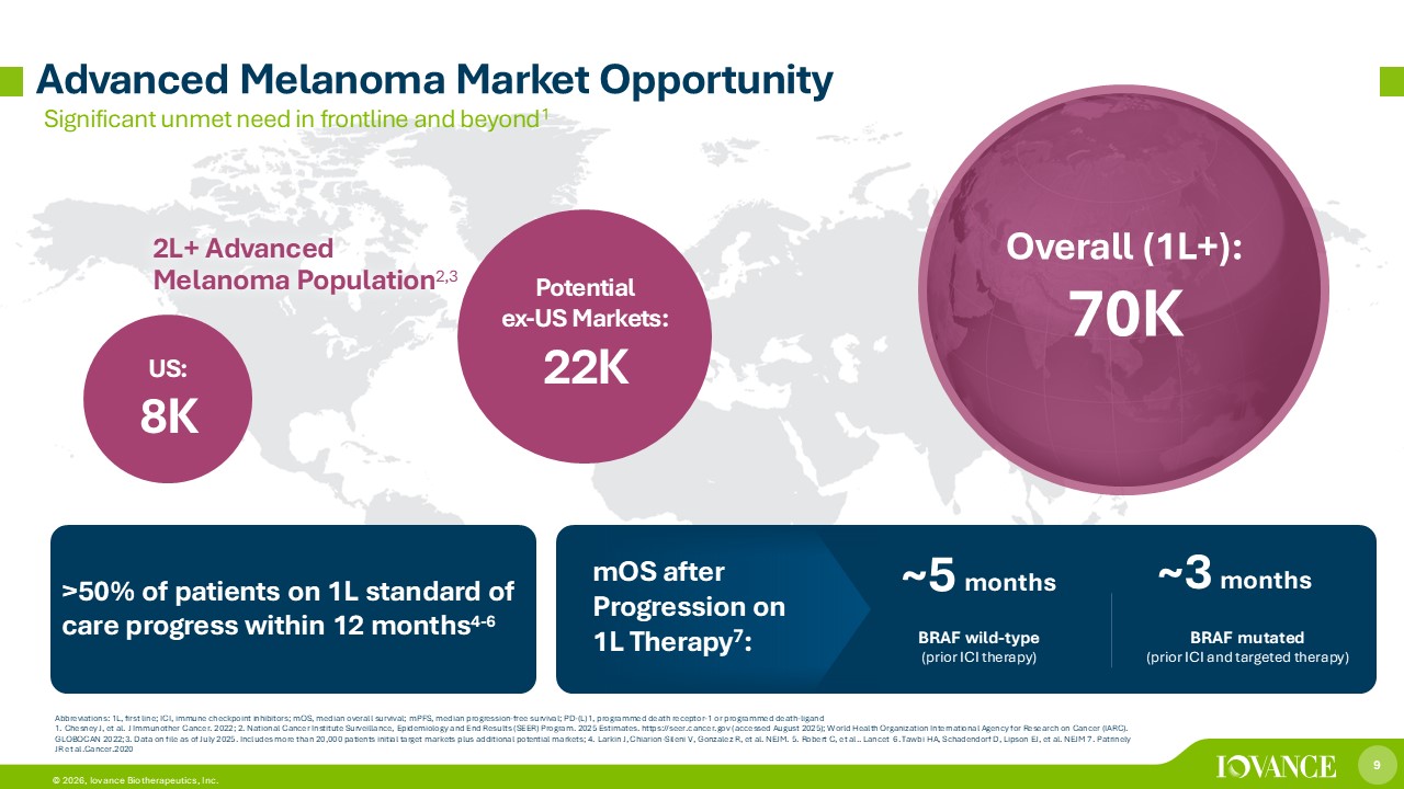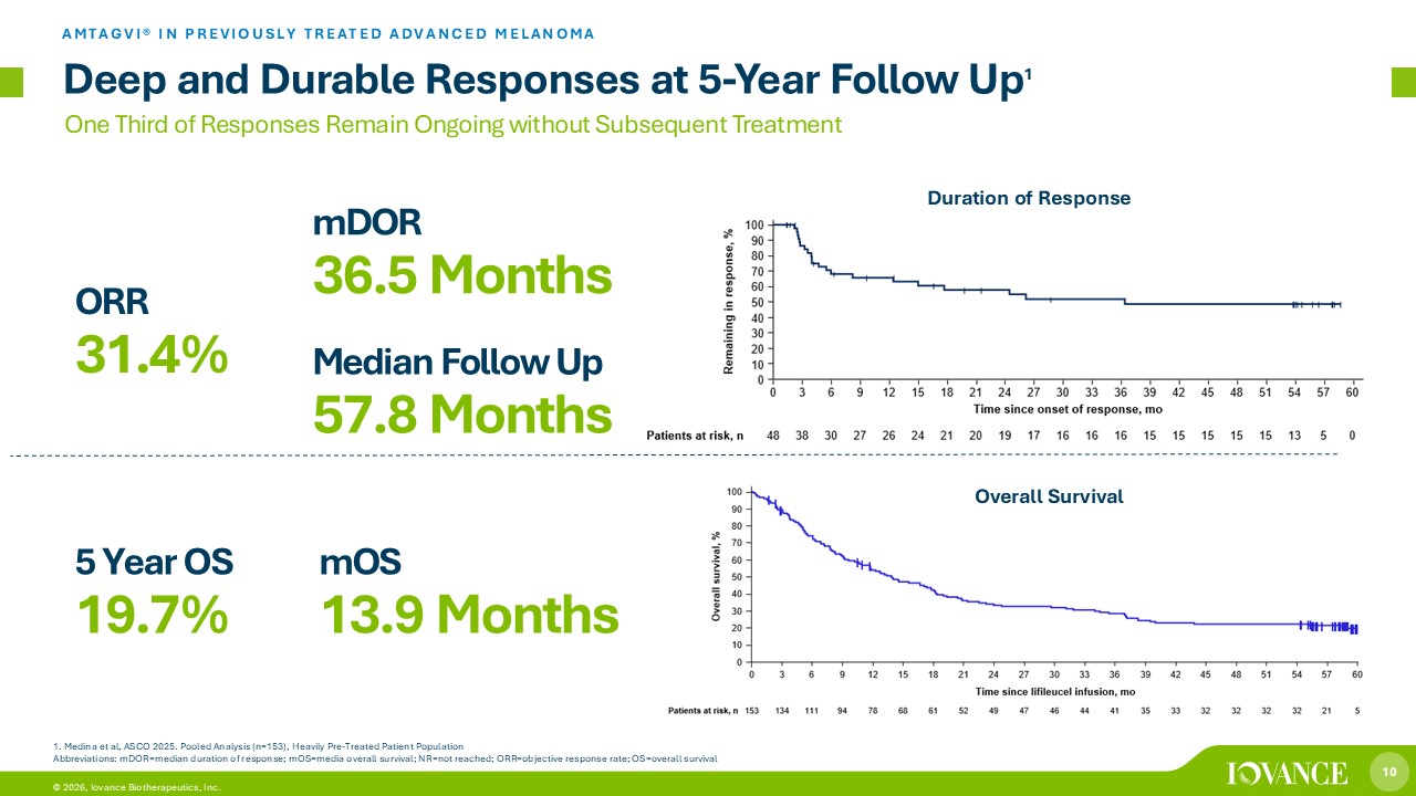 9 © 2026, Iovance Biotherapeutics, Inc. Significant unmet need in frontline and beyond 1 Advanced Melanoma Market Opportunity 2L+ Advanced Melanoma Population 2,3 US: 8K Potential ex - US Markets: 22 K Overall (1L+): 7 0K BRAF wild - type (prior ICI therapy ) ~ 5 months BRAF mutated (prior ICI and targeted therapy) ~ 3 months Abbreviations: 1L , first line; ICI, immune checkpoint inhibitors; mOS , median overall survival; mPFS , median progression - free survival; PD - (L)1, programmed death receptor - 1 or programmed death - ligand 1. Chesney J, et al. J Immunother Cancer. 2022; 2. National Cancer Institute Surveillance, Epidemiology and End Results (SEER) Program. 2025 Estimates. https:/ /s eer.cancer.gov (accessed August 2025); World Health Organization International Agency for Research on Cancer (IARC). GLOBOCAN 2022;3. Data on file as of July 2025. Includes more than 20,000 patients initial target markets plus additional pote nti al markets; 4. Larkin J, Chiarion - Sileni V, Gonzalez R, et al. NEJM. 5. Robert C, et al.. Lancet 6. Tawbi HA, Schadendorf D, Lipson EJ, et al. NEJM 7. Patrinely JR et al.Cancer.2020 >50% of patients on 1L standard of care progress within 12 months 4 - 6 mOS after Progression on 1L Therapy 7 :