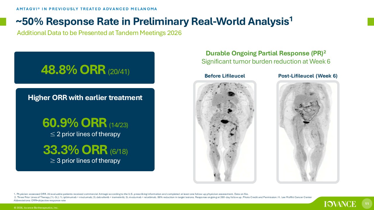 10 © 2026, Iovance Biotherapeutics, Inc. One Third of Responses Remain Ongoing without Subsequent Treatment 5 Year OS 19.7% mDOR 36.5 Months ORR 31.4% mOS 13.9 Months 1. Medina et al, ASCO 2025. Pooled Analysis (n=153), Heavily Pre - Treated Patient Population Abbreviations: mDOR=median duration of response; mOS =media overall survival; NR=not reached; ORR=objective response rate; OS=overall survival Duration of Response Overall Survival Deep and Durable Responses at 5 - Year Follow Up 1 AMTAGVI® IN PREVIOUSLY TREATED ADVANCED MELANOMA Median Follow Up 57.8 Months