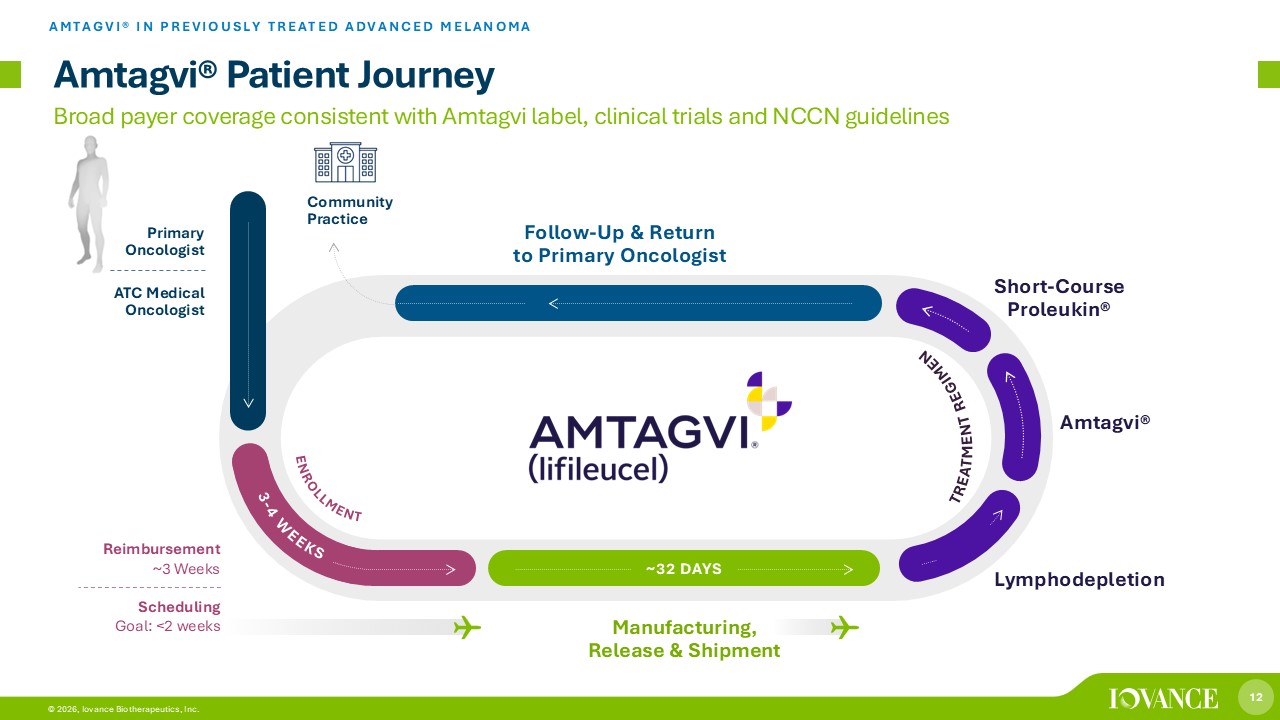 11 © 2026, Iovance Biotherapeutics, Inc. Higher ORR with earlier treatment 60.9% ORR (14/23) ~50% Response Rate in Preliminary Real - World Analysis 1 AMTAGVI® IN PREVIOUSLY TREATED ADVANCED MELANOMA 1. Physician - assessed ORR. All evaluable patients received commercial Amtagvi according to the U.S. prescribing information and completed at least one follow - up physician assessment. Data on file. 2. Three Prior Lines of Therapy (1L - 3L): 1L ipilimumab + nivolumab; 2L dabrafenib + trametinib; 3L nivolumab + relatlimab . 86% reduction in target lesions. Response ongoing at 260 - day follow up. Photo Credit and Permission: H. Lee Moffitt Cancer Cen ter Abbreviations: ORR=objective response rate 48.8 % ORR (20/41) 33.3% ORR (6/18) Before Lifileucel Post - Lifileucel (Week 6) Durable Ongoing Partial Response (PR) 2 Significant tumor burden reduction at Week 6 ≤ 2 prior lines of therapy ≥ 3 prior lines of therapy Additional Data to be Presented at Tandem Meetings 2026