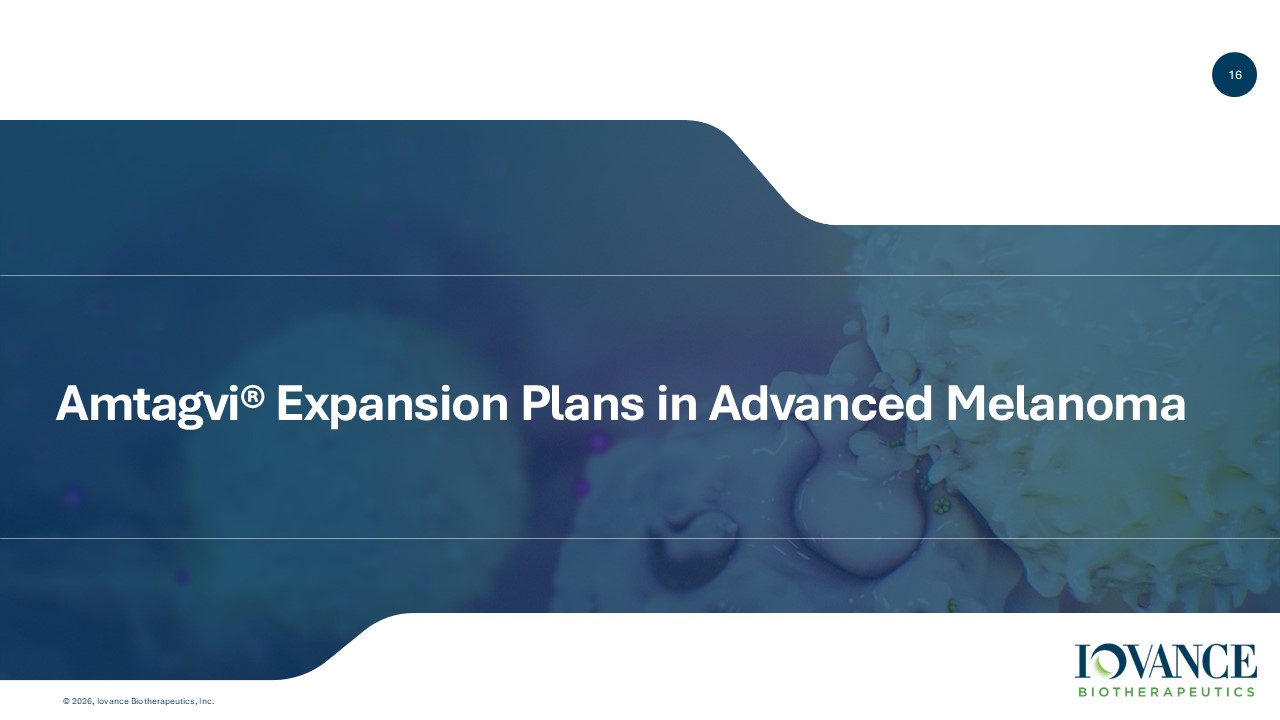 15 © 2026, Iovance Biotherapeutics, Inc. Broad Market Access Data on file as of July 2025. *Plans or policies that cover Amtagvi, including pharmacy benefit managers (PBMs) Abbreviations: NCCN = National Comprehensive Cancer Network Payer medical coverage policies consistent with Amtagvi label, clinical trials and NCCN guidelines Patient lives covered; Majority of patients have private coverage* Typical time to financial clearance 250+ Million ~ 3 Weeks > 75% of Amtagvi patients covered by private payers