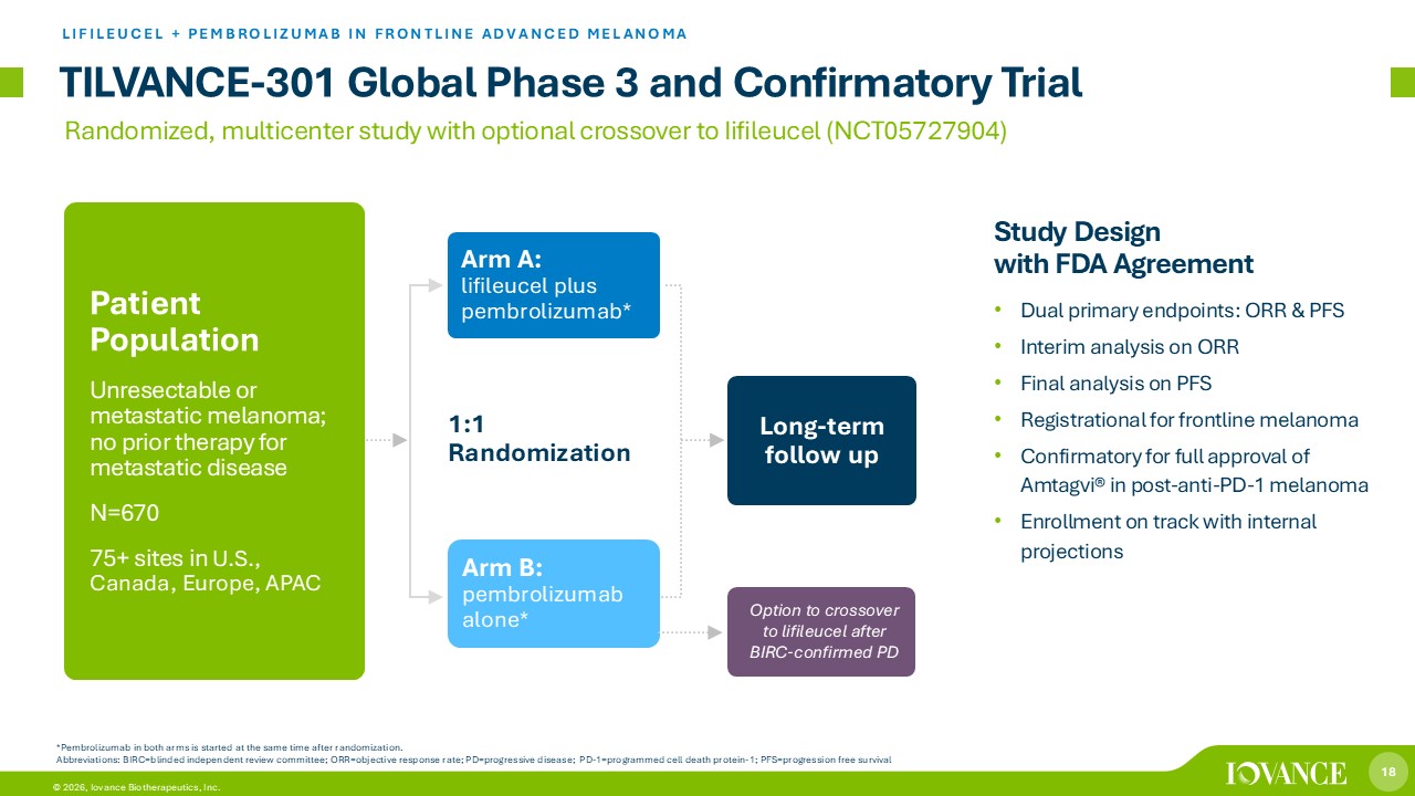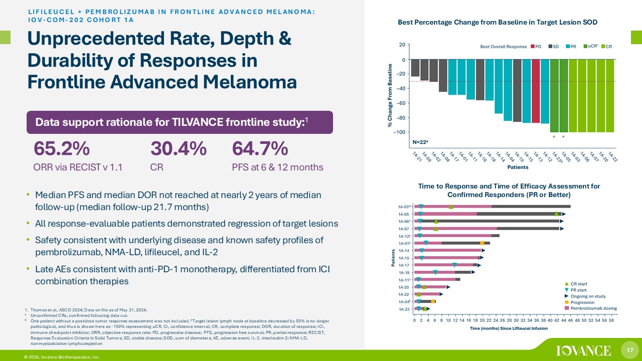 17 © 2026, Iovance Biotherapeutics, Inc. Unprecedented Rate, Depth & Durability of Responses in Frontline Advanced Melanoma • Median PFS and median DOR not reached at nearly 2 years of median follow - up (median follow - up 21.7 months) • All response - evaluable patients demonstrated regression of target lesions • Safety consistent with underlying disease and known safety profiles of pembrolizumab, NMA - LD, lifileucel, and IL - 2 • Late AEs consistent with anti - PD - 1 monotherapy, differentiated from ICI combination therapies LIFILEUCEL + PEMBROLIZUMAB IN FRONTLINE ADVANCED MELANOMA: IOV - COM - 202 COHORT 1A 1. Thomas et al, ASCO 2024; Data on file as of May 31, 2024. * Unconfirmed CRs, confirmed following data cut. A One patient without a postdose tumor response assessment was not included. b Target lesion lymph node at baseline decreased by 50% is no longer pathological, and thus is shown here as - 100% representing uCR. CI, confidence interval; CR, complete response; DOR, duration of response; ICI, immune checkpoint inhibitor; ORR, objective response rate; PD, progressive disease; PFS, progression free survival; PR, part ial response; RECIST, Response Evaluation Criteria in Solid Tumors; SD, stable disease; SOD, sum of diameters; AE, adverse event; IL - 2, interleukin - 2; NMA - LD, nonmyeloablative lymphodepletion Data support rationale for TILVANCE frontline study: 1 65.2% ORR via RECIST v 1.1 30.4% CR 64.7% PFS at 6 & 12 months Best Percentage Change from Baseline in Target Lesion SOD Time to Response and Time of Efficacy Assessment for Confirmed Responders (PR or Better)