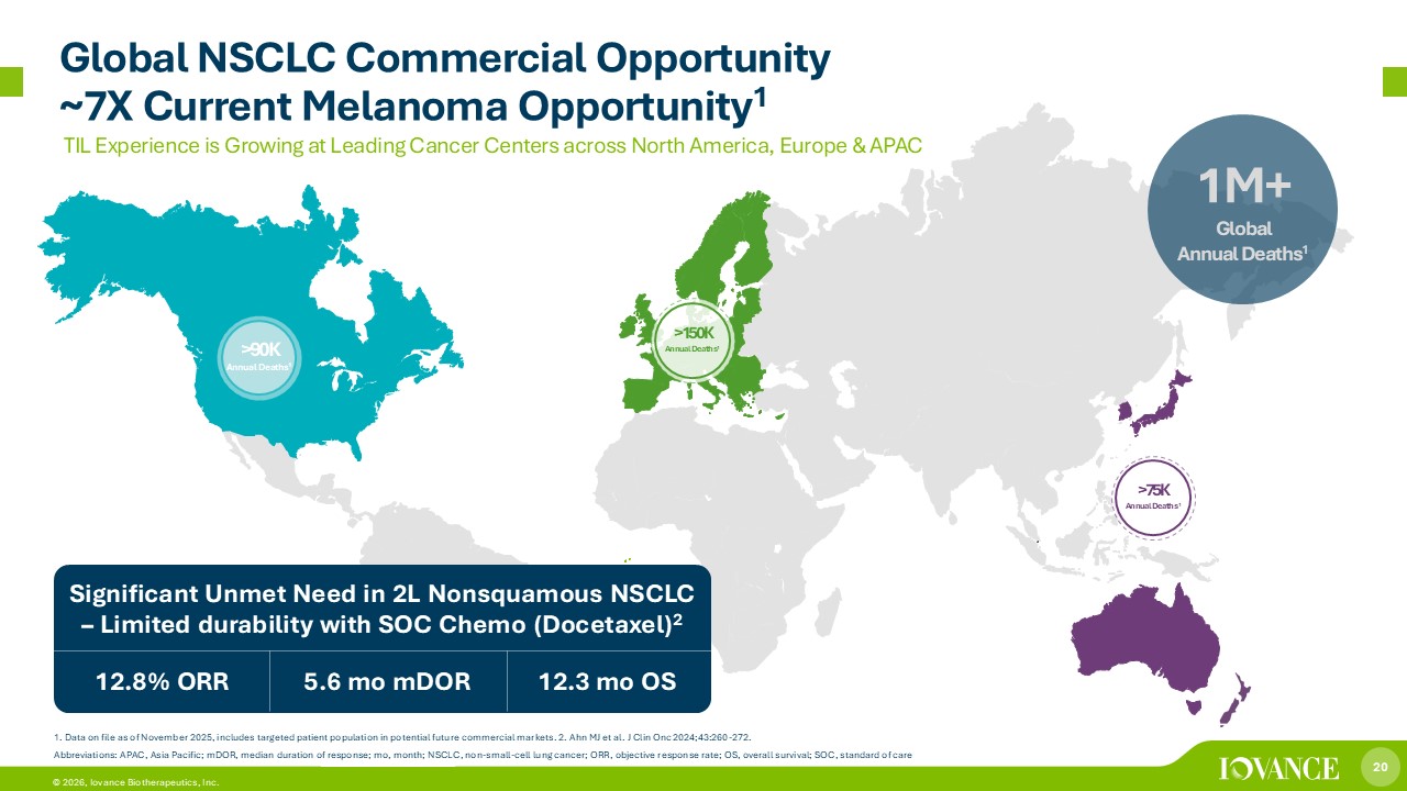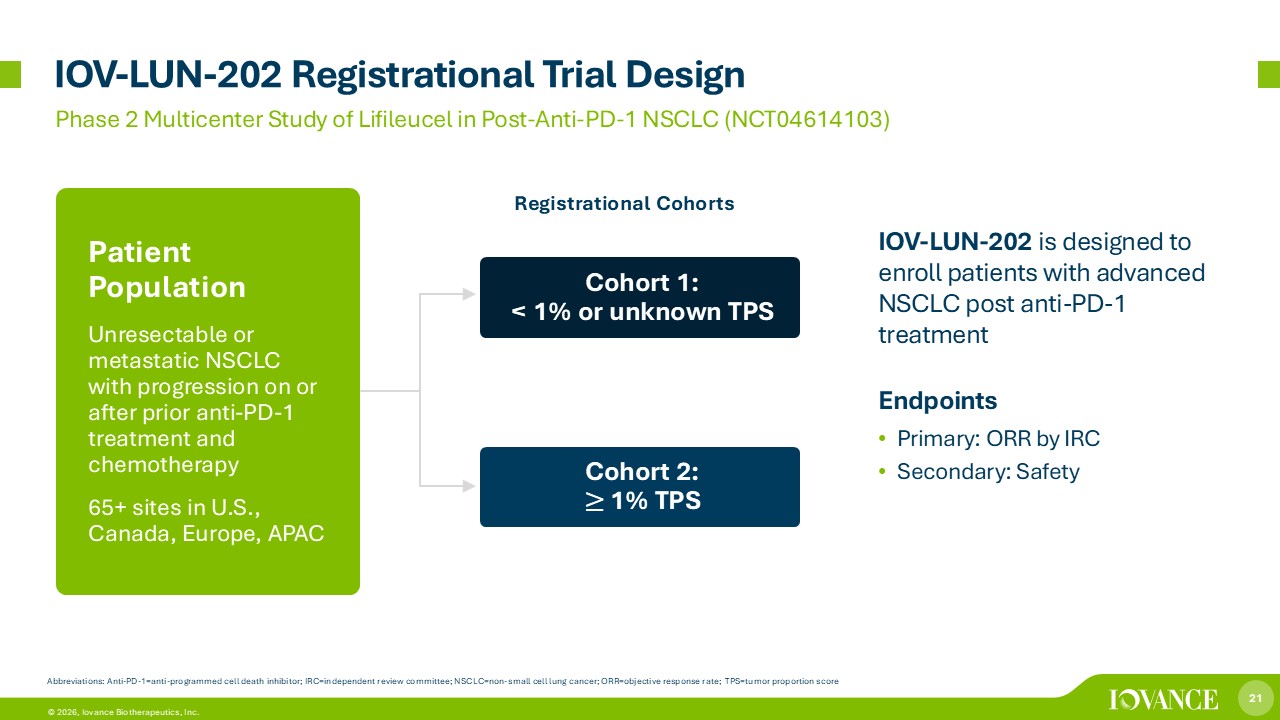 20 © 2026, Iovance Biotherapeutics, Inc. 1M+ Global Annual Deaths 1 Significant Unmet Need in 2L Nonsquamous NSCLC – Limited durability with SOC Chemo (Docetaxel) 2 5.6 mo mDOR 12.3 mo OS 12.8% ORR >90K Annual Deaths 1 1. Data on file as of November 2025, includes targeted patient population in potential future commercial markets. 2. Ahn MJ et al. J Clin Onc 2024;43:260 - 272. Abbreviations: APAC, Asia Pacific; mDOR, median duration of response; mo , month; NSCLC, non - small - cell lung cancer; ORR, objective response rate; OS, overall survival; SOC, standard of care >150K Annual Deaths 1 >75K Annual Deaths 1 TIL Experience is Growing at Leading Cancer Centers across North America, Europe & APAC Global NSCLC Commercial Opportunity ~7X Current Melanoma Opportunity 1