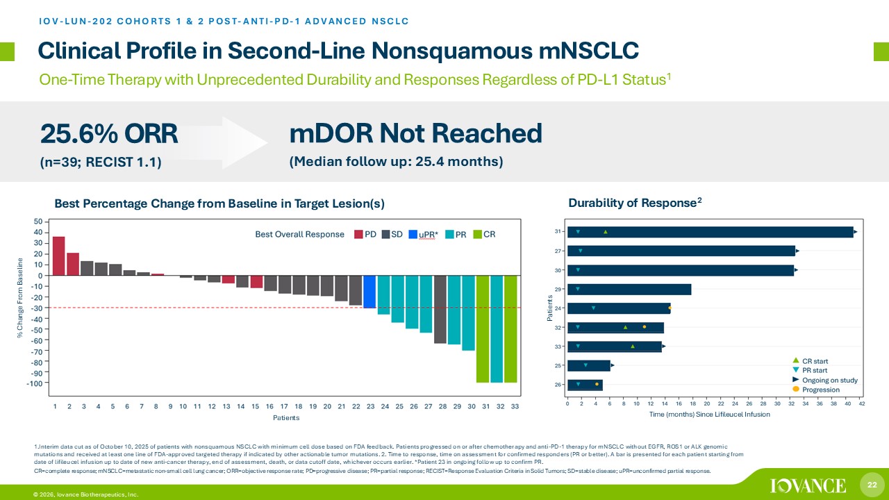 21 © 2026, Iovance Biotherapeutics, Inc. IOV - LUN - 202 Registrational Trial Design Phase 2 Multicenter Study of Lifileucel in Post - Anti - PD - 1 NSCLC (NCT04614103) Abbreviations: Anti - PD - 1 = anti - programmed cell death inhibitor; IRC=independent review committee; NSCLC=non - small cell lung cancer; ORR = objective response rate; TPS=tumor proportion score Iovance TIL Therapy Lifileucel in NSCLC IOV - LUN - 202 is designed to enroll patients with advanced NSCLC post anti - PD - 1 treatment Endpoints • Primary: ORR by IRC • Secondary: Safety Patient Population Unresectable or metastatic NSCLC with progression on or after prior anti - PD - 1 treatment and chemotherapy 65+ sites in U.S., Canada, Europe, APAC Cohort 1: < 1% or unknown TPS Cohort 2: ≥ 1% TPS Registrational Cohorts