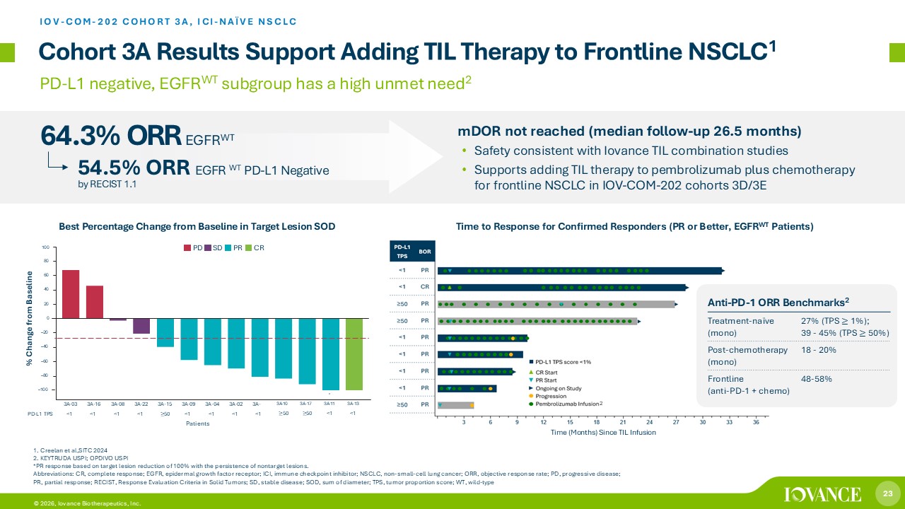 22 © 2026, Iovance Biotherapeutics, Inc. Clinical Profile in Second - Line Nonsquamous mNSCLC IOV - LUN - 202 COHORTS 1 & 2 POST - ANTI - PD - 1 ADVANCED NSCLC 1. Interim data cut as of October 10, 2025 of patients with nonsquamous NSCLC with minimum cell dose based on FDA feedback. Pati ent s progressed on or after chemotherapy and anti - PD - 1 therapy for mNSCLC without EGFR, ROS1 or ALK genomic mutations and received at least one line of FDA - approved targeted therapy if indicated by other actionable tumor mutations. 2. Time to response, time on assessment for confirmed responders (PR or better). A bar is presented for each patient starting f rom date of lifileucel infusion up to date of new anti - cancer therapy, end of assessment, death, or data cutoff date, whichever occu rs earlier. *Patient 23 in ongoing follow up to confirm PR. CR=complete response; mNSCLC =metastatic non - small cell lung cancer; ORR=objective response rate; PD=progressive disease; PR=partial response; RECIST=Respons e Evaluation Criteria in Solid Tumors; SD=stable disease; uPR =unconfirmed partial response. One - Time Therapy with Unprecedented Durability and Responses Regardless of PD - L1 Status 1 25.6% ORR (n=39; RECIST 1.1) mDOR Not Reached (Median follow up: 25.4 months) Patients Time (months) Since Lifileucel Infusion % Change From Baseline Durability of Response 2 Patients Best Percentage Change from Baseline in Target Lesion(s)
