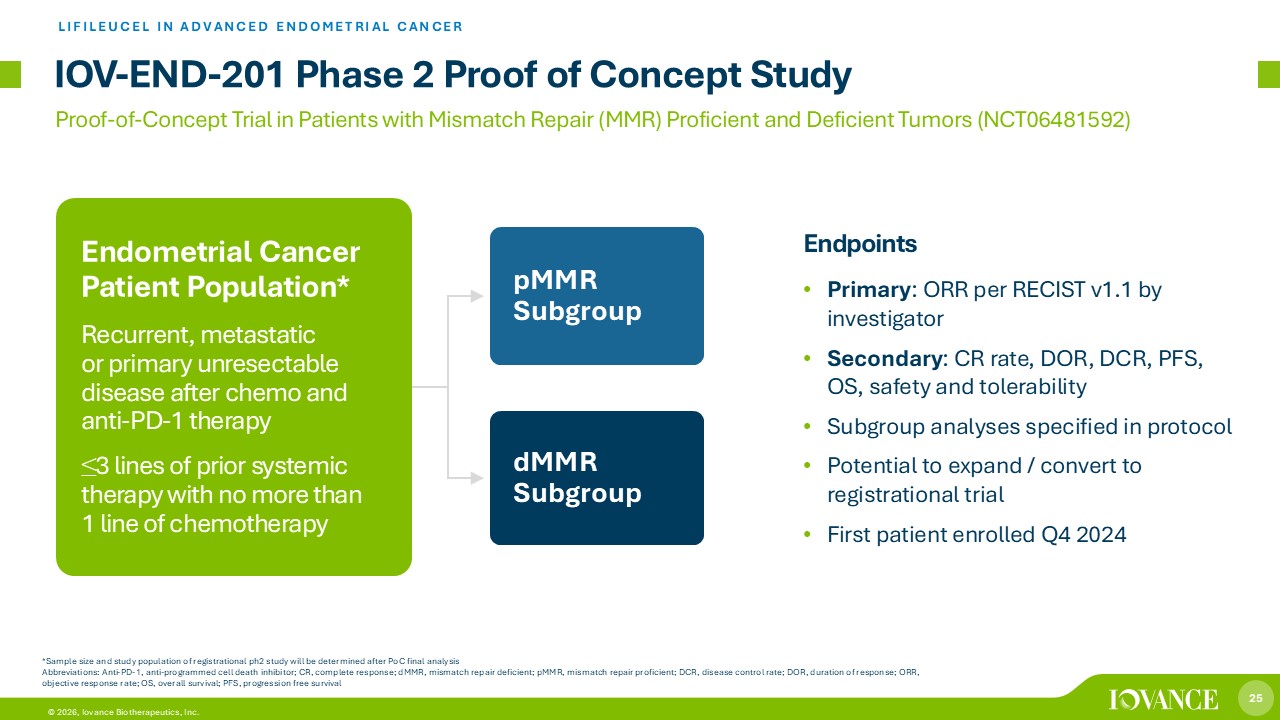 24 © 2026, Iovance Biotherapeutics, Inc. 1. National Cancer Institute Surveillance, Epidemiology and End Results (SEER) Program. 2025 Estimates. https://seer.cancer.gov (accessed August 2025); 2. World Health Organization International Agency for Research on Cancer (IARC). GLOBOCAN 2022 3. NCCN Guidelines Version 2.2024 Endometrial Carcinoma; 4. Kang et al, Nature Portfolio, Scientific Reports, 2022; 5. Makker V, et al. N Engl J Med. 2022; 6. McMeekin S, et al. Gynecol Oncol. 2015. Abbreviations: Anti - PD - 1 = anti - programmed cell death inhibitor; pMMR = proficient DNA mismatch repair; dMMR = deficient DNA mismatch repair; SOC=standard of care; TMB - H = tumor mutational burden high; ORR = objective response rate Potential Market for Advanced Endometrial Cancer LIFILEUCEL IN ADVANCED ENDOMETRIAL CANCER Immunosensitive Tumor Type with Significant Unmet Need in 2L+ Anti - PD - (L)1 moving into front - line therapy setting 3 No standard of care for 2L+ post - anti - PD - 1 • Molecularly defined subgroups with available targeted therapies are small • ORR with mono - chemotherapy after front - line chemo doublet: ~15% 5,6 • Limited data on treatments after anti - PD - (L)1 ~14K ~98K US annual uterine cancer deaths 1 5 - yr survival ( distant metastases ) 1 Global deaths 2 19.5% Endometrial Cancer Biomarkers 4 dMMR : 27% pMMR : 73% >90% of Uterine Cancers are Endometrial