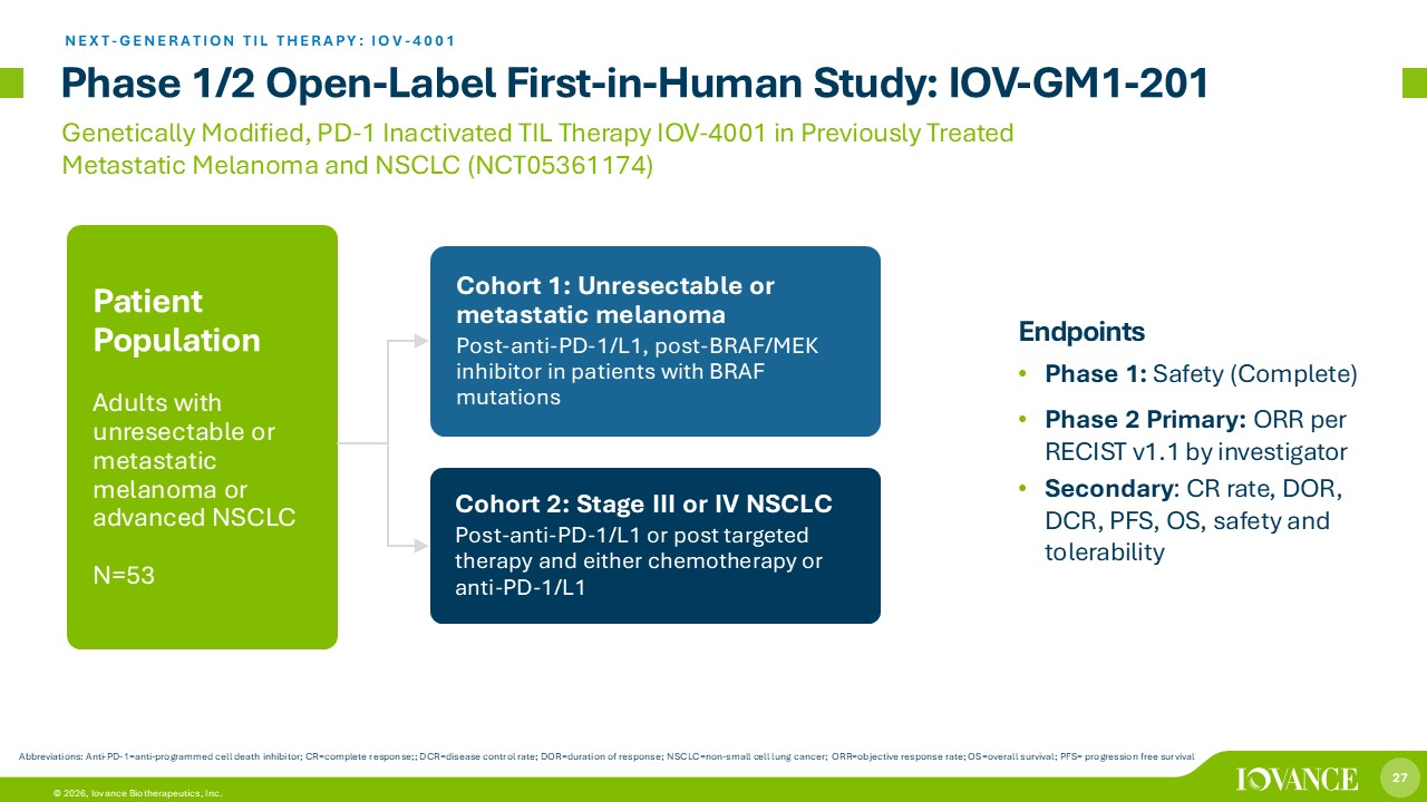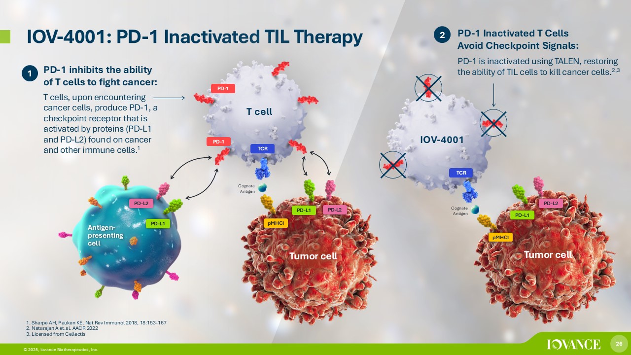 26 © 2026, Iovance Biotherapeutics, Inc. 26 © 2025, Iovance Biotherapeutics, Inc. IOV - 4001: PD - 1 Inactivated TIL Therapy 2 T cell PD - 1 PD - 1 inhibits the ability of T cells to fight cancer: T cells, upon encountering cancer cells, produce PD - 1, a checkpoint receptor that is activated by proteins (PD - L1 and PD - L2) found on cancer and other immune cells. 1 PD - L2 PD - L1 PD - 1 TCR pMHCI PD - L2 PD - L1 Tumor cell Antigen - presenting cell 1. Sharpe AH, Pauken KE, Nat Rev Immunol 2018, 18:153 - 167 2. Natarajan A et.al. AACR 2022 3. Licensed from Cellectis 1 IOV - 4001 TCR pMHCI PD - L2 PD - L1 Tumor cell PD - 1 Inactivated T Cells Avoid Checkpoint Signals: PD - 1 is inactivated using TALEN, restoring the ability of TIL cells to kill cancer cells. 2,3 Cognate Antigen Cognate Antigen