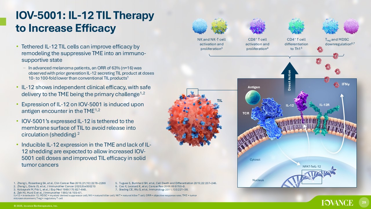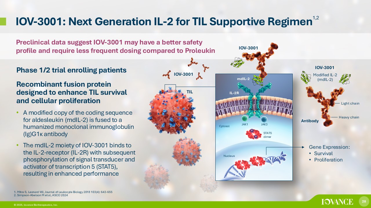 28 © 2026, Iovance Biotherapeutics, Inc. 28 © 2025, Iovance Biotherapeutics, Inc. IOV - 3001: Next Generation IL - 2 for TIL Supportive Regimen 1,2 Phase 1/2 trial enrolling patients Recombinant fusion protein designed to enhance TIL survival and cellular proliferation • A modified copy of the coding sequence for aldesleukin (mdIL - 2) is fused to a humanized monoclonal immunoglobulin (Ig)G1 κ antibody • The mdIL - 2 moiety of IOV - 3001 binds to the IL - 2 - receptor (IL - 2R) with subsequent phosphorylation of signal transducer and activator of transcription 5 (STAT5), resulting in enhanced performance 1. Mitra S, Leonard WJ, Journal of Leukocyte Biology 2018 103(4): 643 - 655 2. Simpson - Abelson M et al, ASCO 2024 Gene Expression: • Survival • Proliferation mdIL - 2 IL - 2R JAK1 P JAK3 STAT5 dimer Cytosol Nucleus P IOV - 3001 IOV - 3001 Heavy chain Light chain IOV - 3001 Modified IL - 2 (mdIL - 2) TIL Antibody Preclinical data suggest IOV - 3001 may have a better safety profile and require less frequent dosing compared to Proleukin